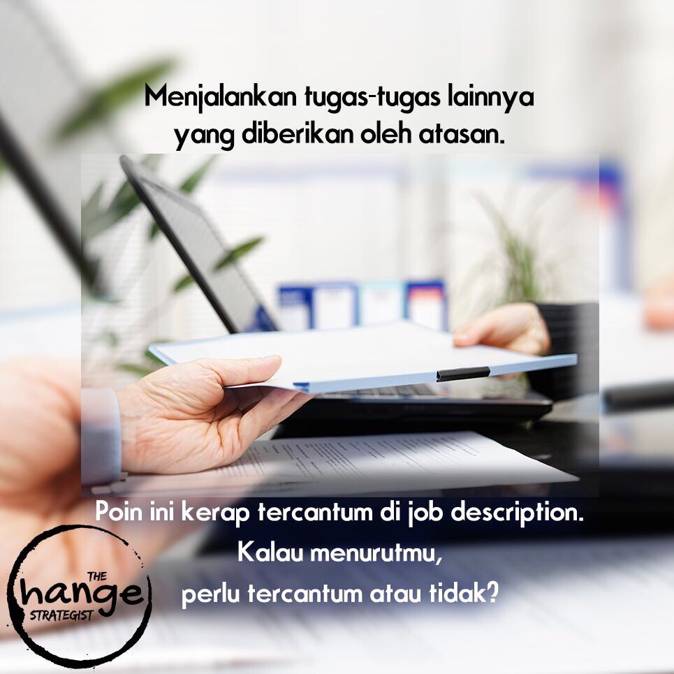 Job description adalah alat kalibrasi aktivitas dalam sebuah posisi di dalam organisasi. Jadi, job description yang efektif haruslah operasional, bukan konseptual, dan harus bisa spesifik. Adanya poin ‘karet’ dalam job description akan membuat akuntabilitas kinerja posisi tersebut menjadi tidak jelas.