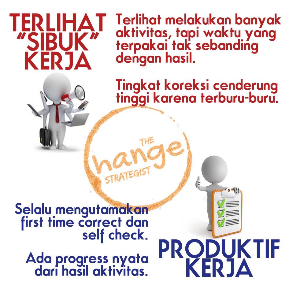 Jelilah melihat kesibukan di tempat kerja, karena mungkin kesibukan itu justru karena hal yang tidak diperlukan….. atau karena rendahnya kemampuan untuk memastikan kualitas proses kerja. Ingat, sibuk tidak menjamin hasil yang baik.